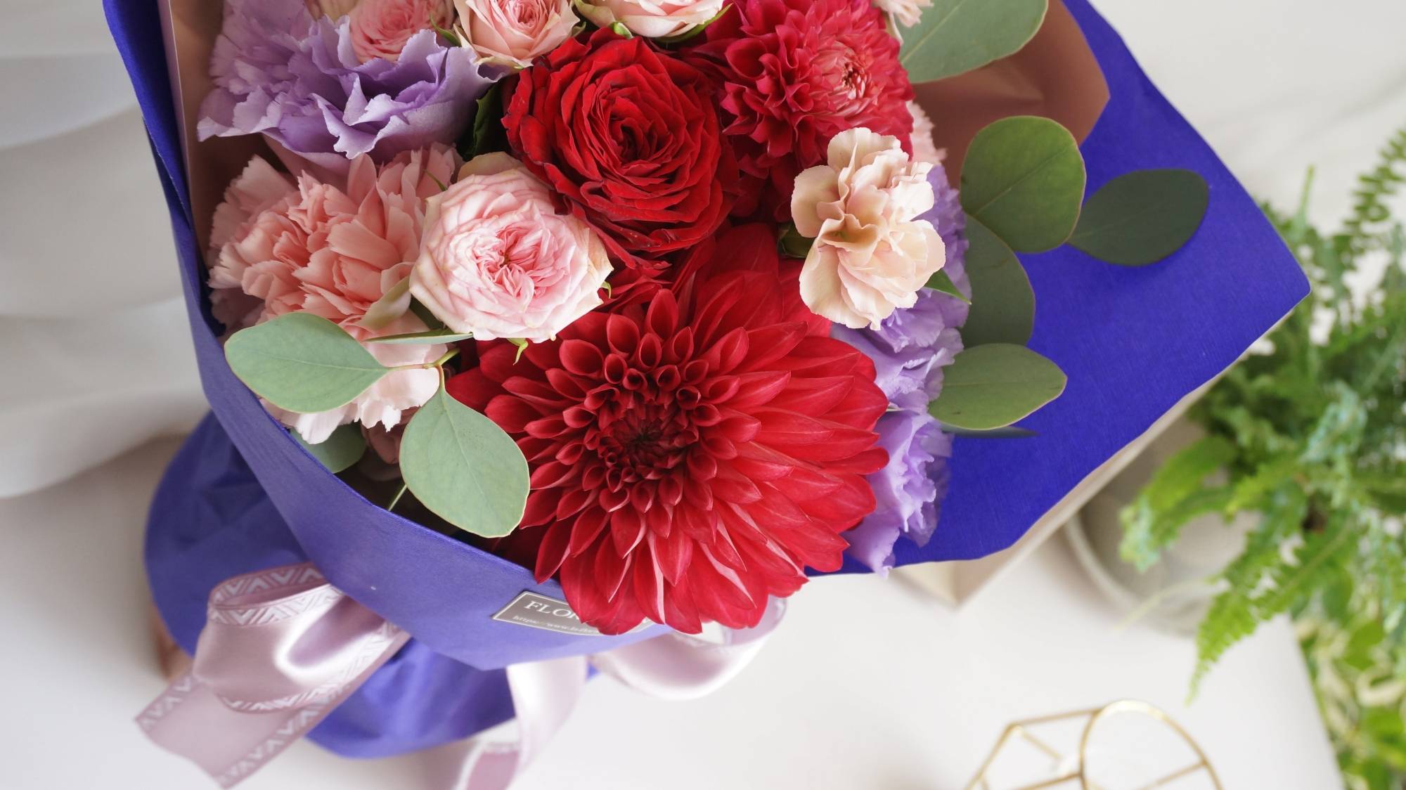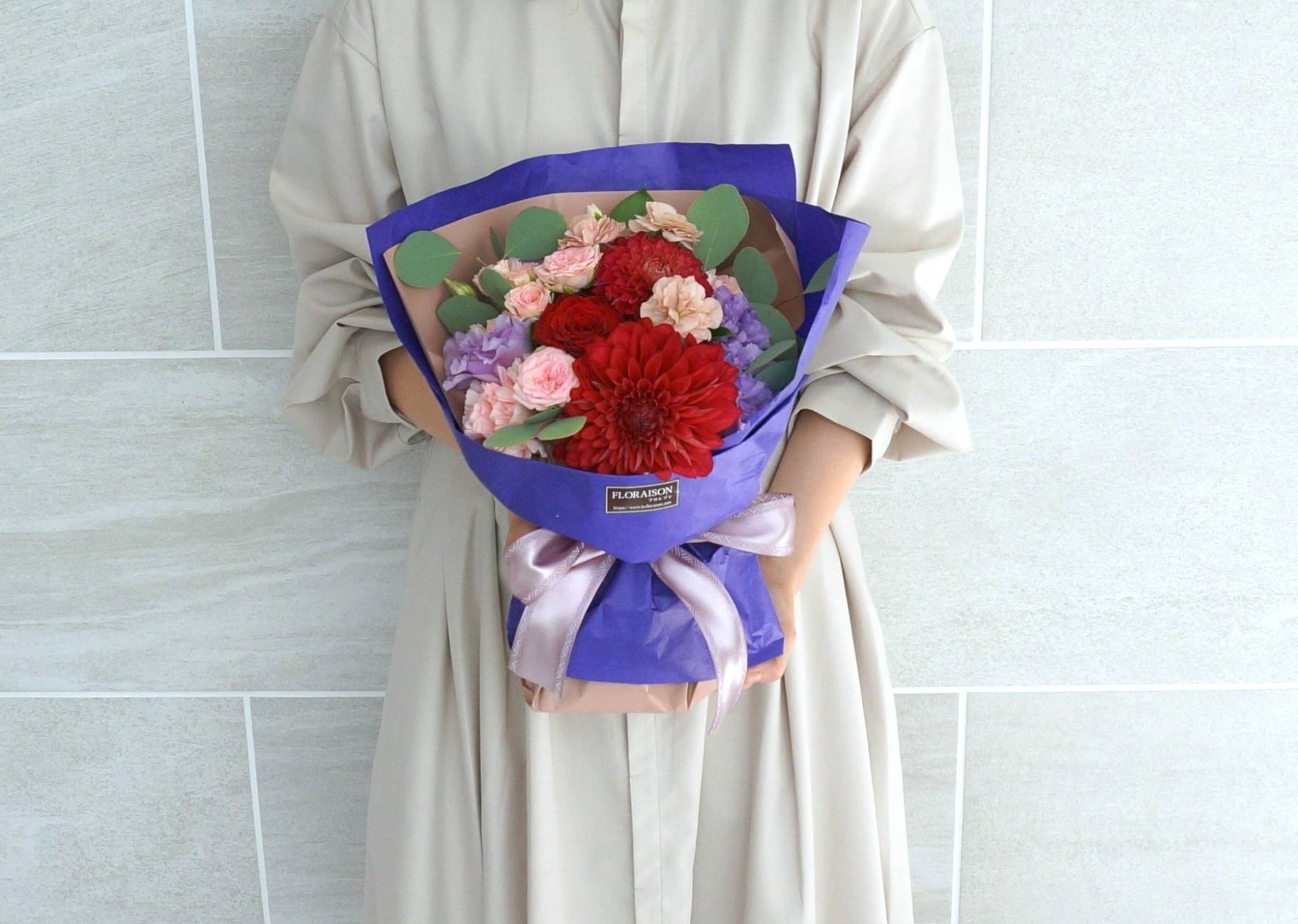 華やかなダリアを際立たせる大胆なパープルのラッピングが存在感たっぷり。