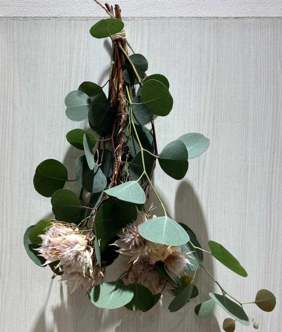 今の時期手に入りやすく、ドライにオススメの切り花としてグリーン系はユーカリ、ブルーアイス。