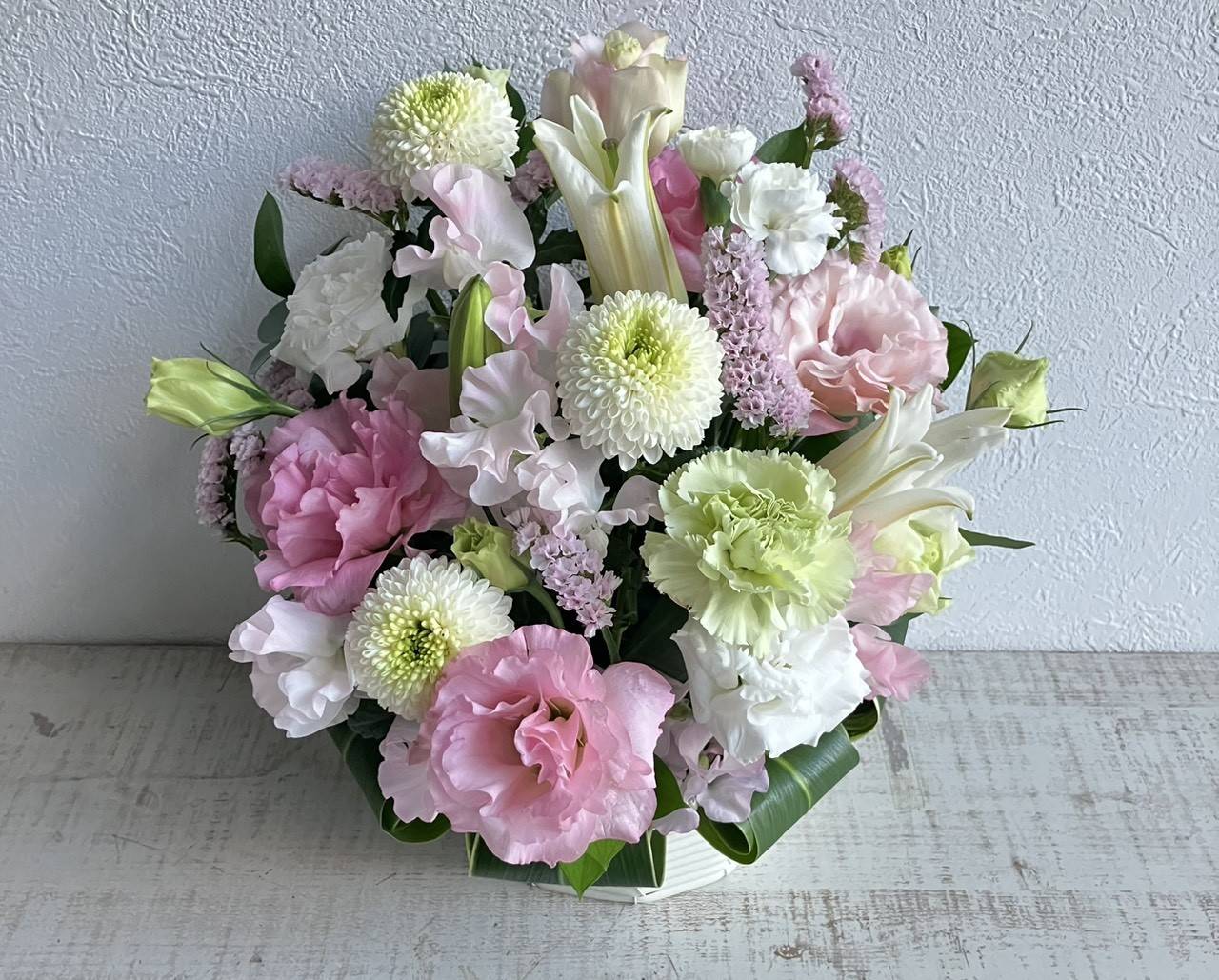 春のお花、スイートピーと淡いピンク色のお花を使用したお供えアレンジメントです。