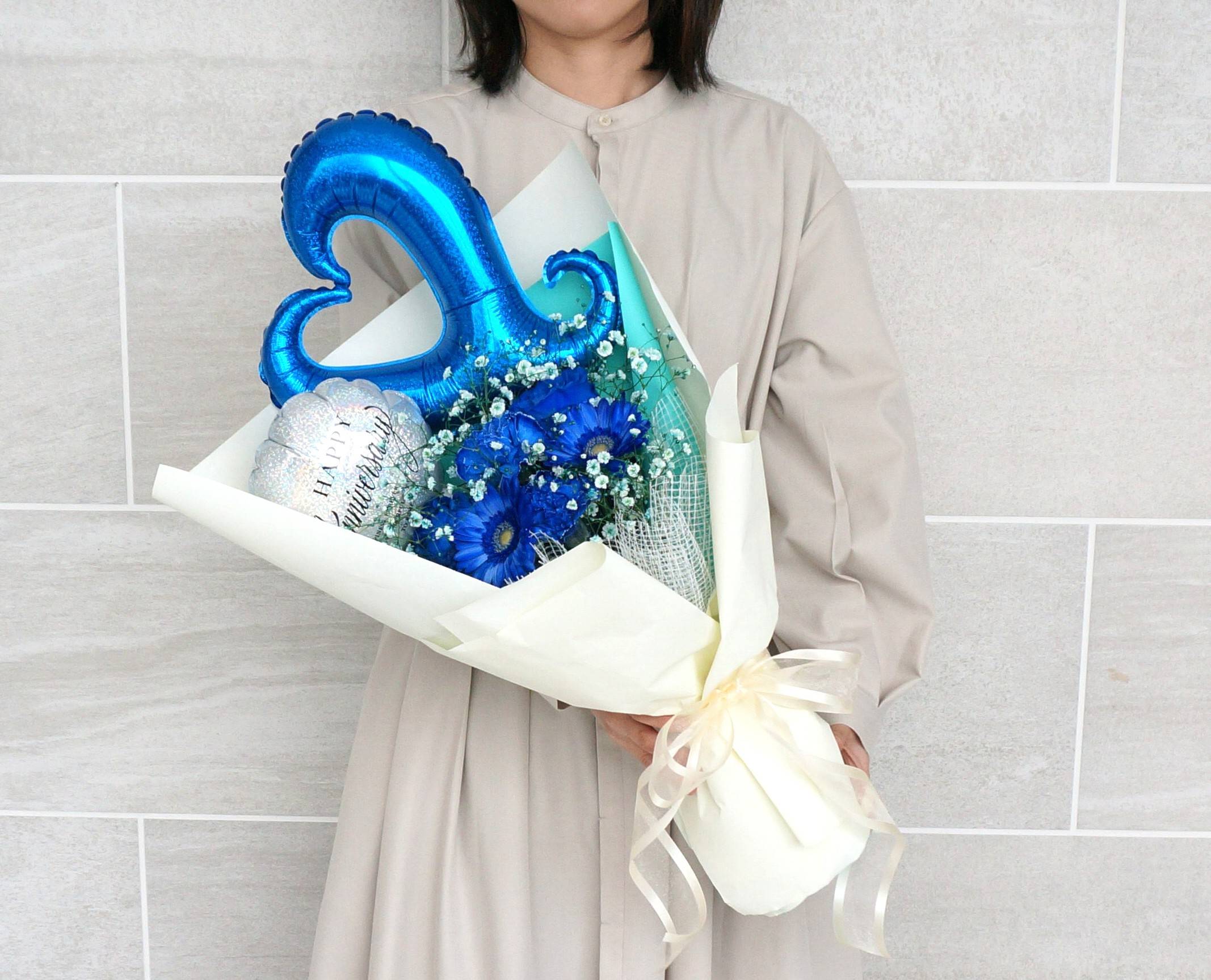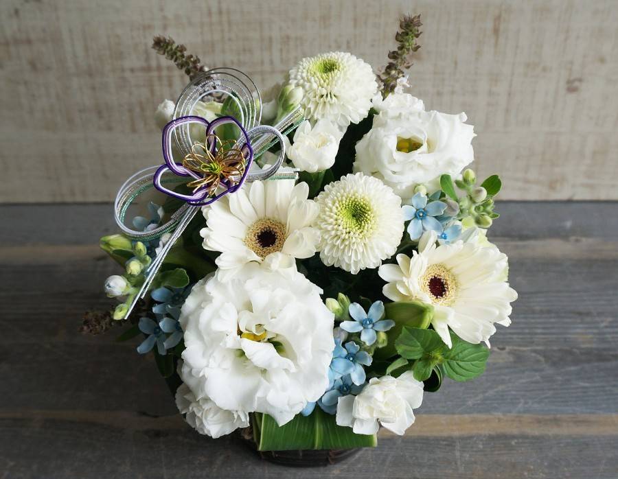 生花には青いバラ、カーネーション、ガーベラを使用しているので「こんなお花もあるんだ!」と喜んでいただけるはず。