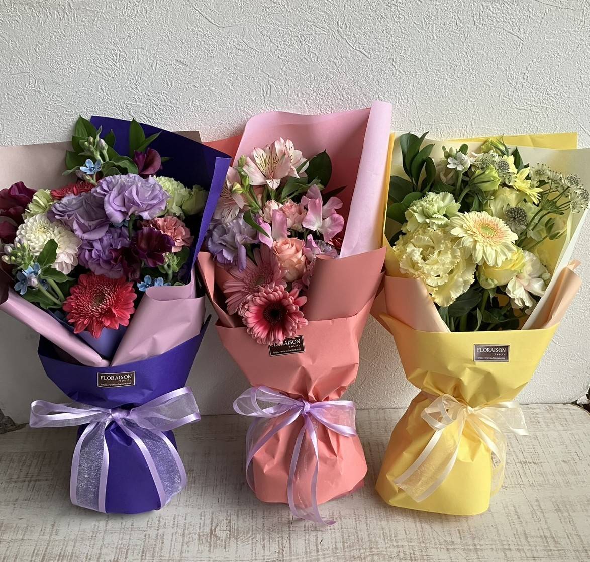 左より、パープル・ピンク・イエロー系のおまかせ花束のご依頼です。