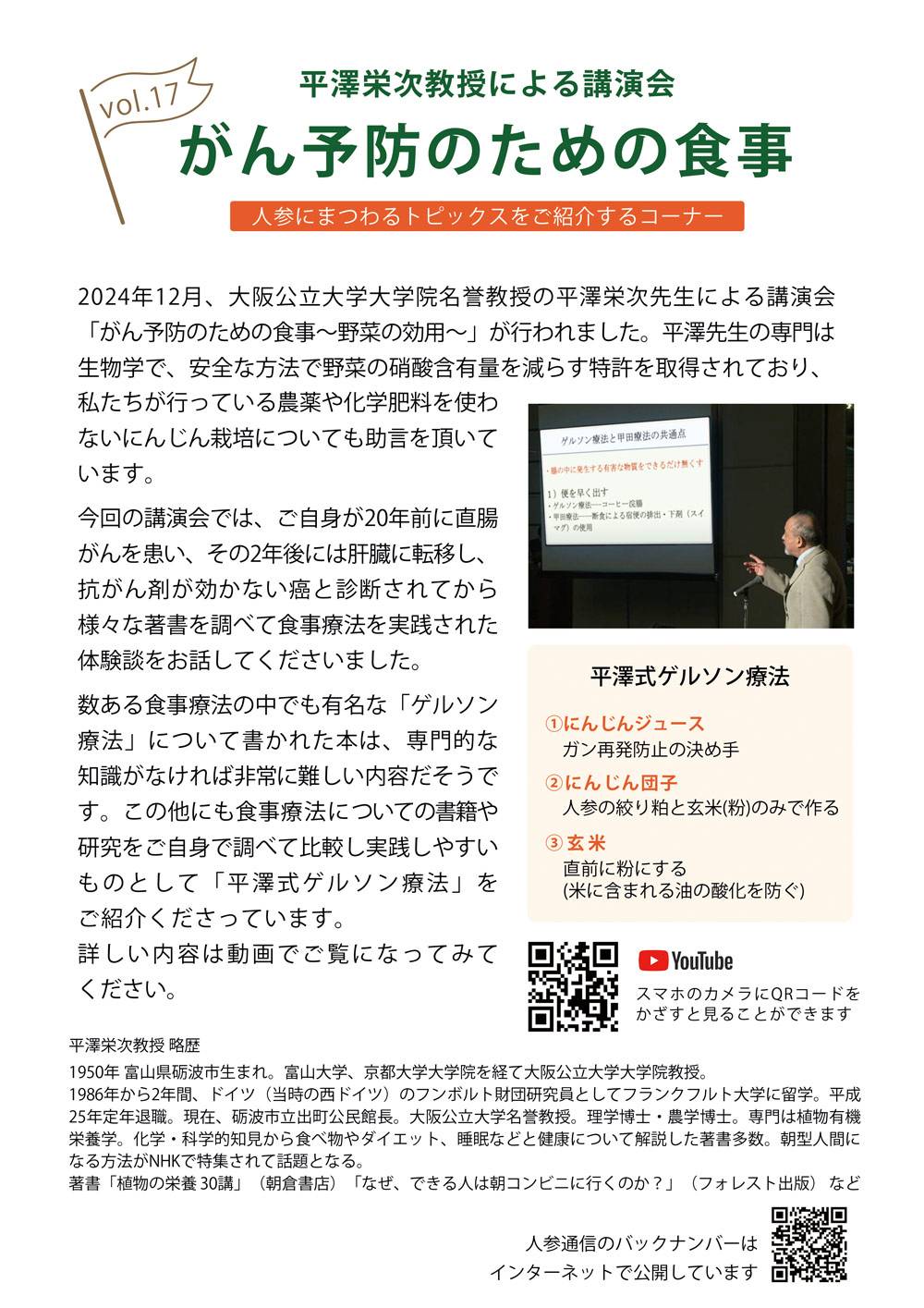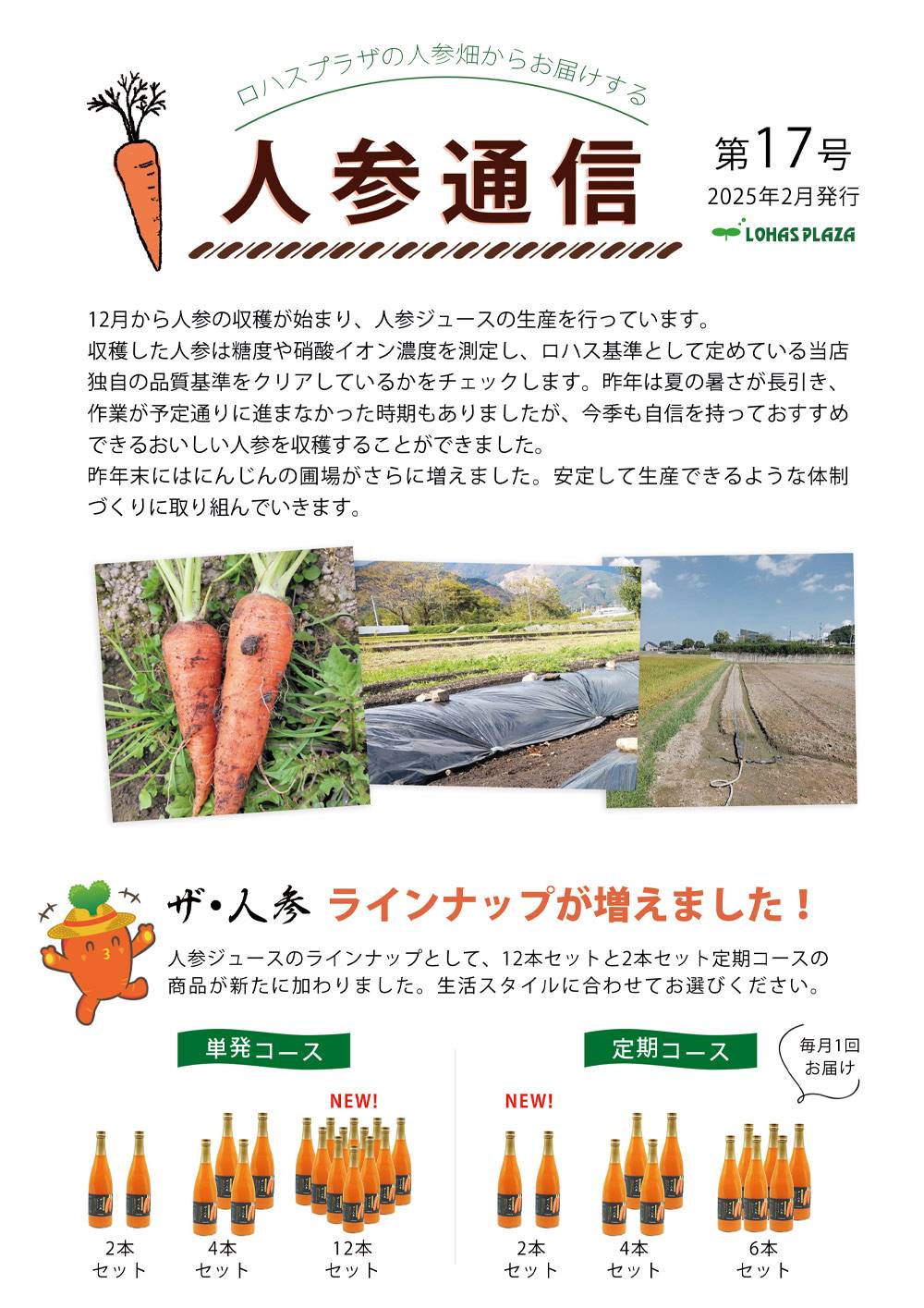 ロハス 人参通信第17号を発行しました 2025.2.1 ロハスプラザでは定期的に人参通信を発行し、ロハスプラザでの人参栽培の様子や人参にまつわるトピックスをご紹介しています。 人参通信第17号を発行しましたのでご紹介します。 人参通信はロハスプラザのオンラインショップでお買い物をして頂いた方に配布中のほか、バックナンバーはオンラインショップで公開しています。