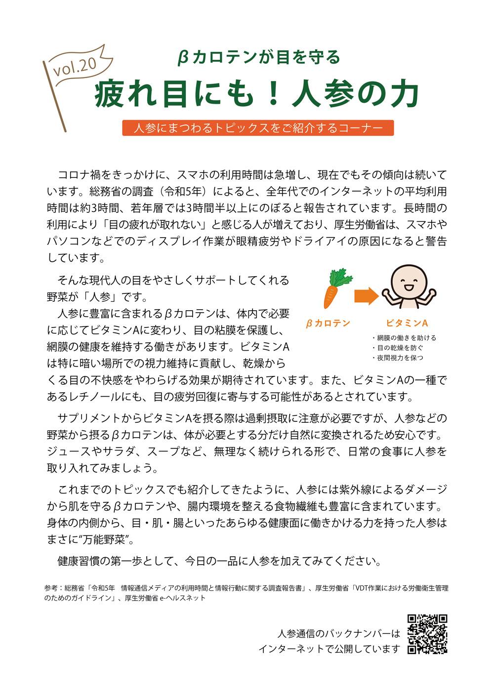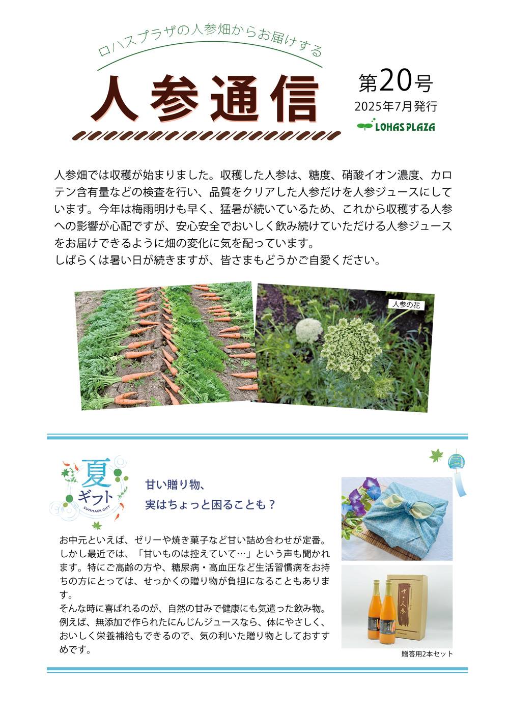ロハス 人参通信第20号を発行しました 2025.7.1 ロハスプラザでは定期的に人参通信を発行し、ロハスプラザでの人参栽培の様子や人参にまつわるトピックスをご紹介しています。 人参通信第20号を発行しましたのでご紹介します。 人参通信はロハスプラザのオンラインショップでお買い物をして頂いた方に配布中のほか、バックナンバーはオンラインショップで公開しています。