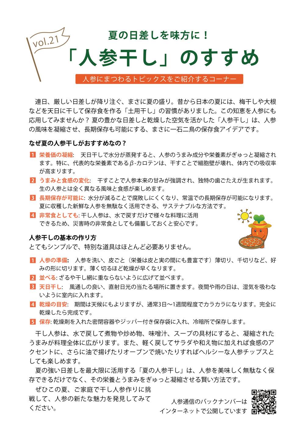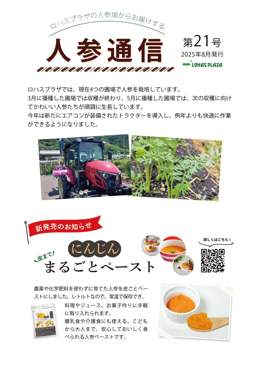 ロハス 人参通信第21号を発行しました 2025.8.1 ロハスプラザでは定期的に人参通信を発行し、ロハスプラザでの人参栽培の様子や人参にまつわるトピックスをご紹介しています。 人参通信第21号を発行しましたのでご紹介します。 人参通信はロハスプラザのオンラインショップでお買い物をして頂いた方に配布中のほか、バックナンバーはオンラインショップで公開しています。