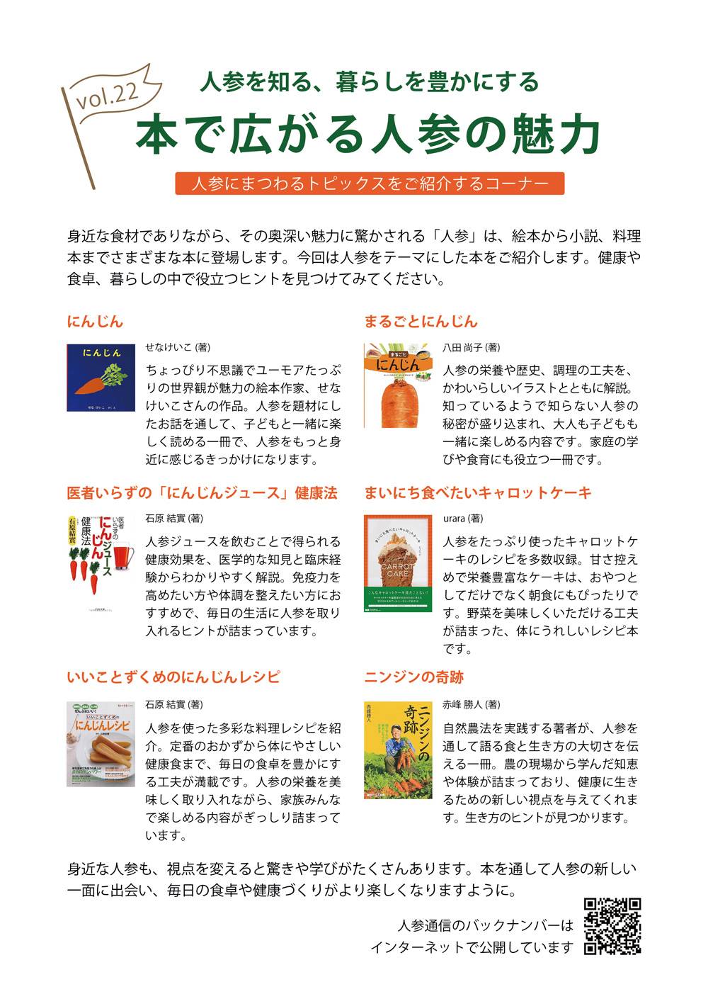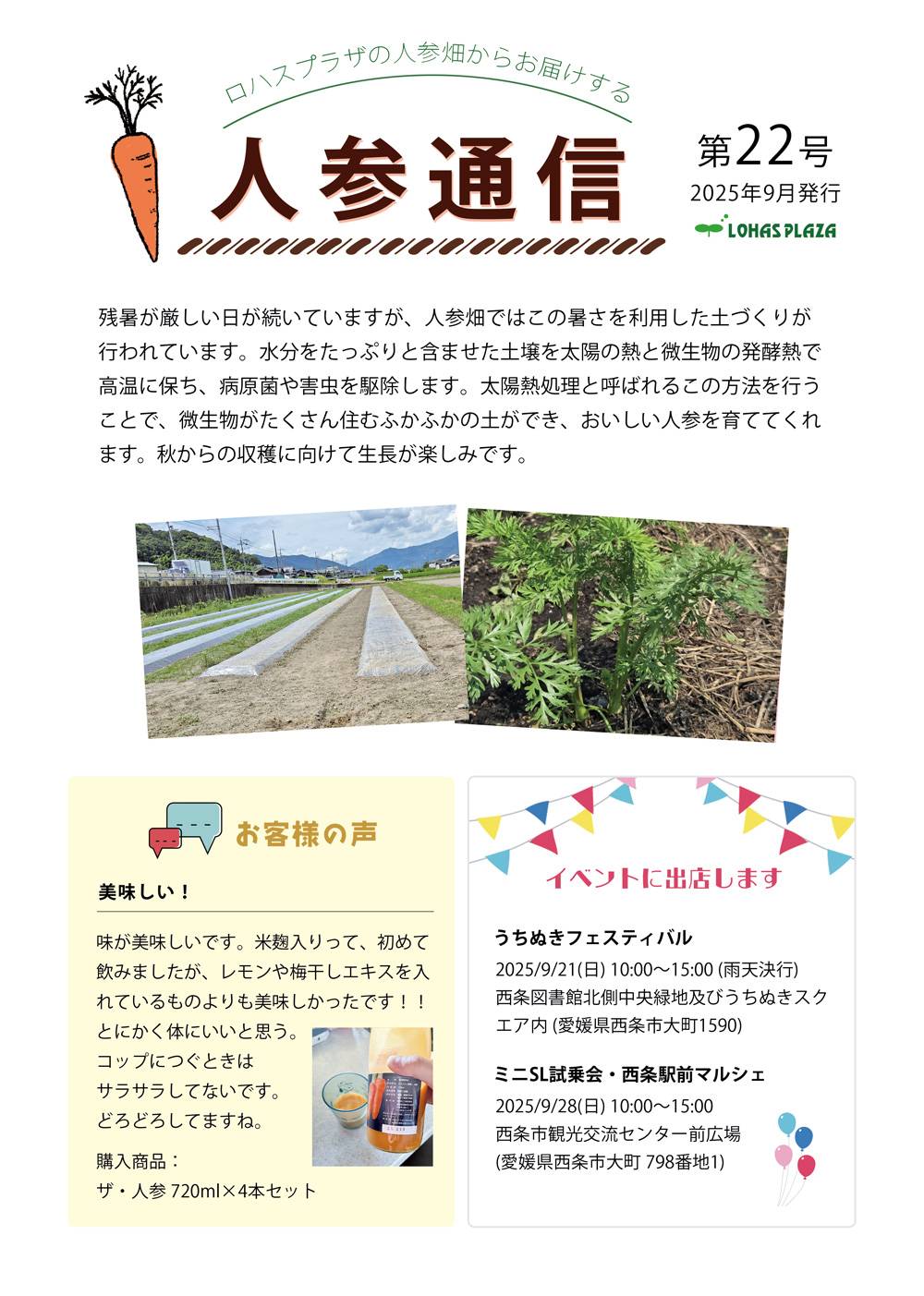 ロハス 人参通信第22号を発行しました 2025.9.1 ロハスプラザでは定期的に人参通信を発行し、ロハスプラザでの人参栽培の様子や人参にまつわるトピックスをご紹介しています。 人参通信第22号を発行しましたのでご紹介します。 人参通信はロハスプラザのオンラインショップでお買い物をして頂いた方に配布中のほか、バックナンバーはオンラインショップで公開しています。