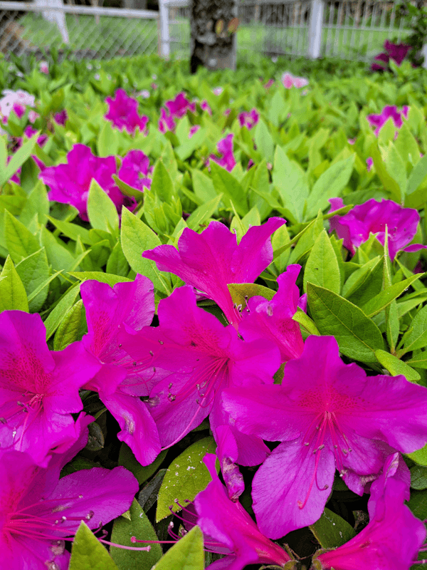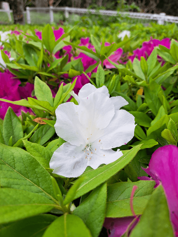 門の近くでは、白と濃いピンクのツツジが見頃を迎えました。