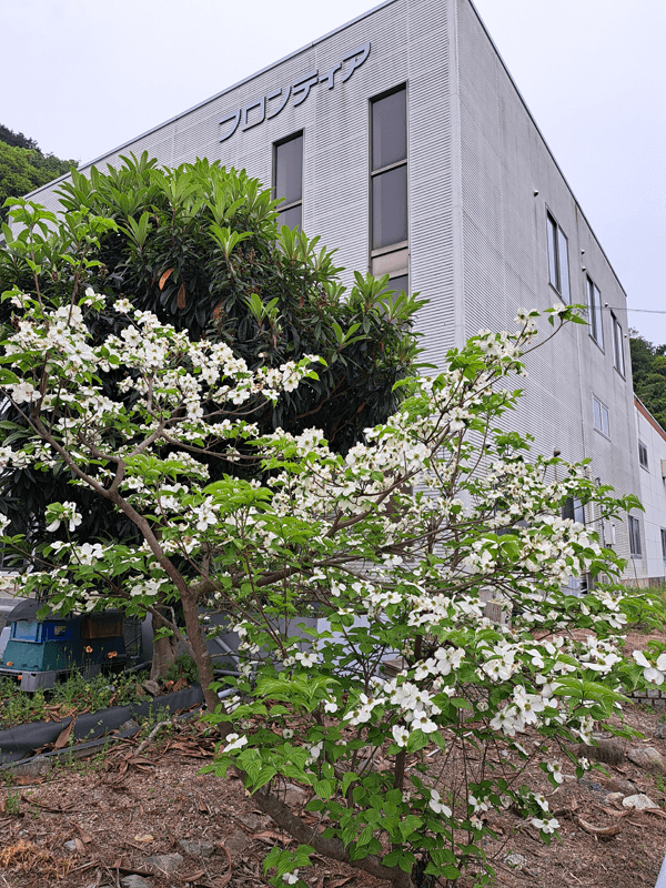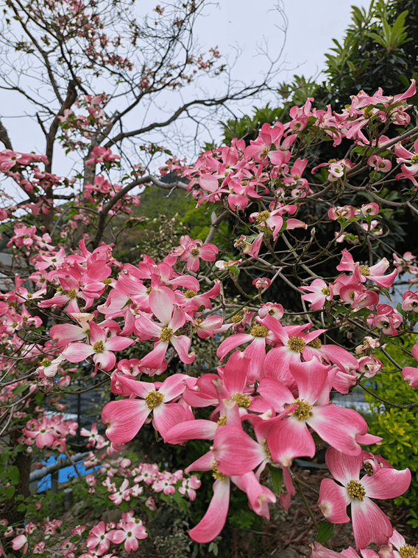 建物のそばでは、ピンクのハナミズキが枝いっぱいに花を広げています。