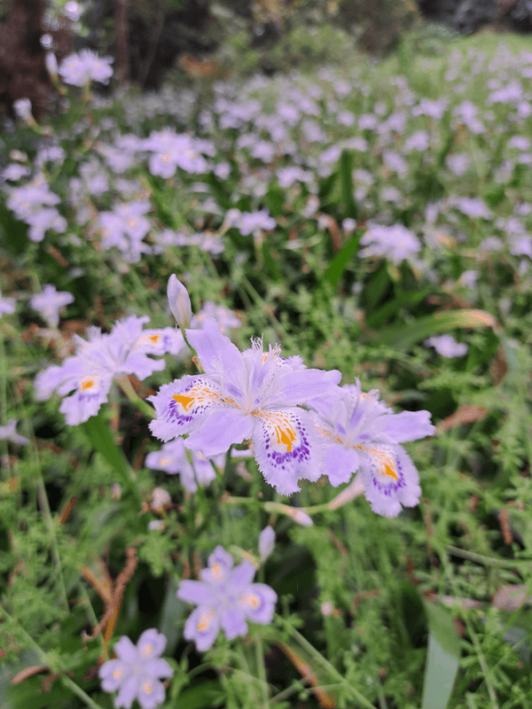 足元に目を向けると、淡い紫と白のシャガが群生しています。