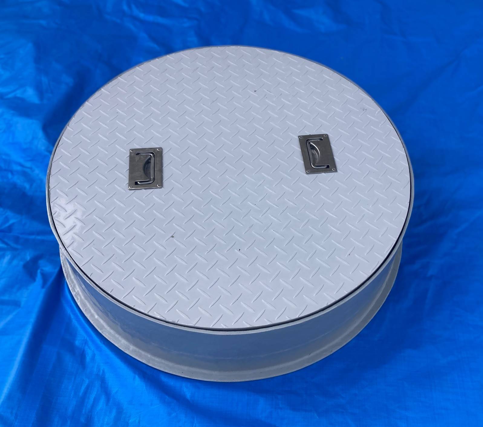 嵩上げ付マンホール 商品名 嵩上げ付マンホール 材質 FRP 加工方法 カット穴あけ加工組立加工 説明 •用途: 浸透桝への雨水流入防止、および点検口の嵩上げ 寸法: 蓋:φ980㎜ × 厚み30㎜ 嵩上げ材:高さ(H) 300㎜ •材質: FRP + ウレタン(軽量・高耐食仕様) 従来のコンクリート製や金属製の蓋では、その重さから点検作業が重労働になりがちです。今回はFRPとウレタンを組み合わせた複合材を採用することで、φ980mmという大型サイズながら、一人でも簡単に持ち上げられる軽さを実現しました。 ギャラリー ※クリックすると拡大できます。